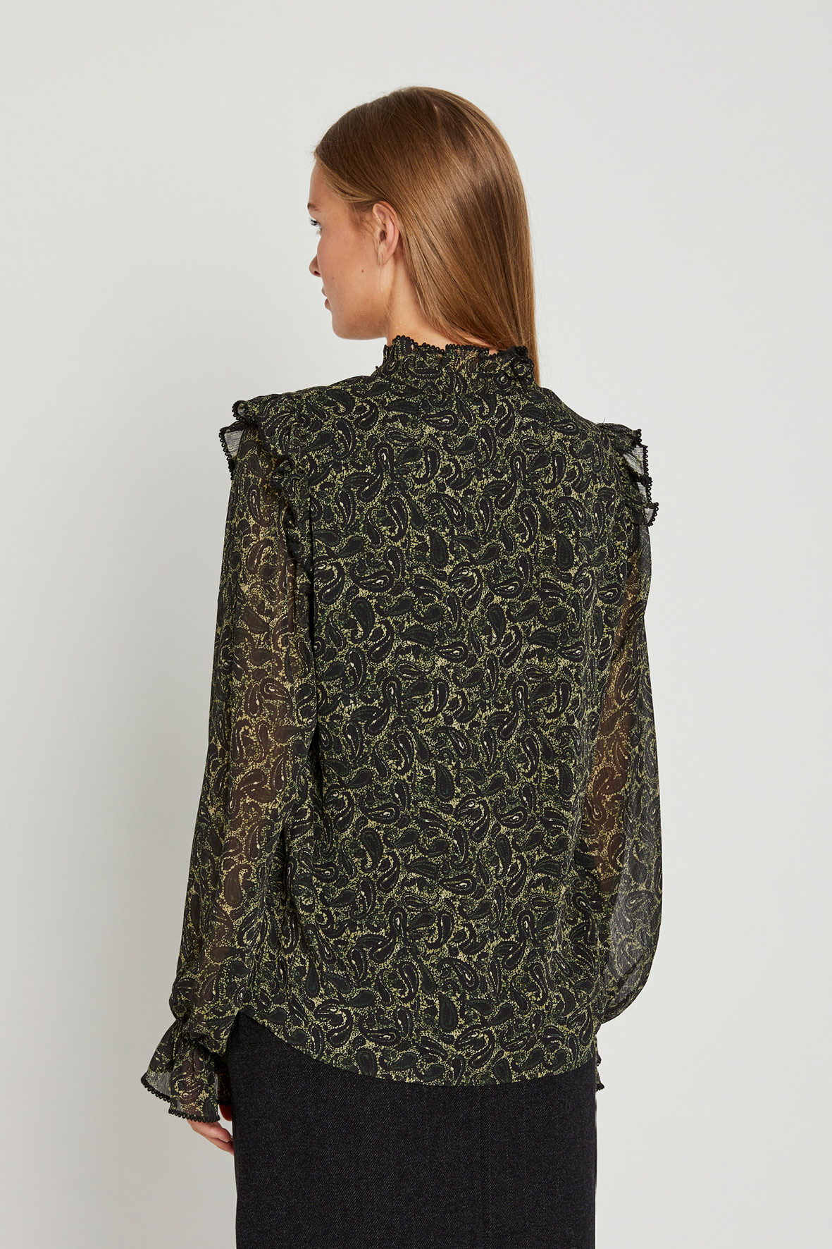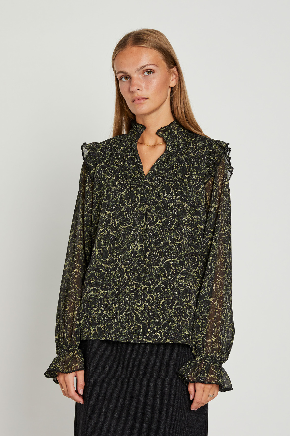 Fiona Blouse er en smuk og elegant bluse, der tilføjer et feminint touch til din garderobe. Med flæsemanchetter på ærmene, læg detaljer foran, en O-hals med slids og en lille flæsekrave, er Fiona Blouse perfekt til både arbejde og fritid.