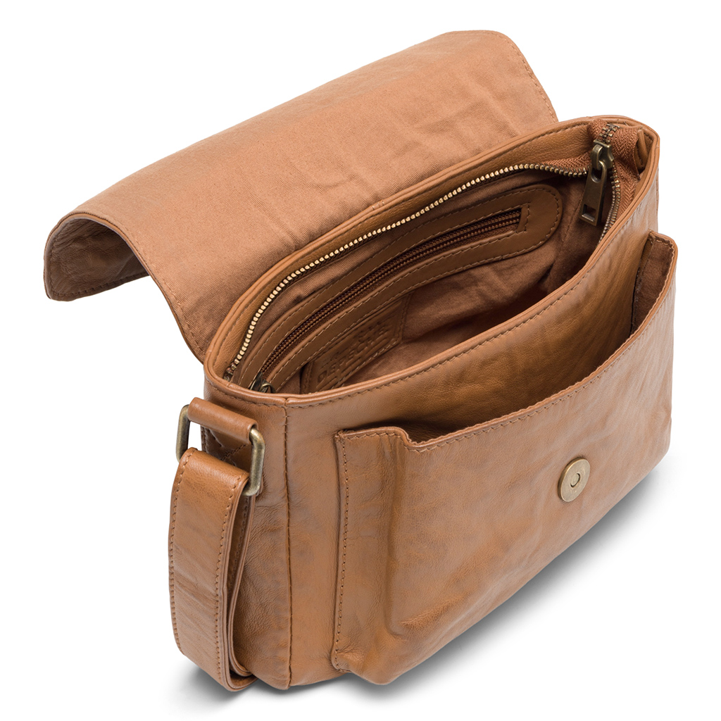Elegant taske med en magnetlukning på forsiden, rummeligt hovedrum, lynlås og to lukkede lommer. Kommer med en aftagelig, justerbar skulderrem og smukke beslag i guldfarvet metal.