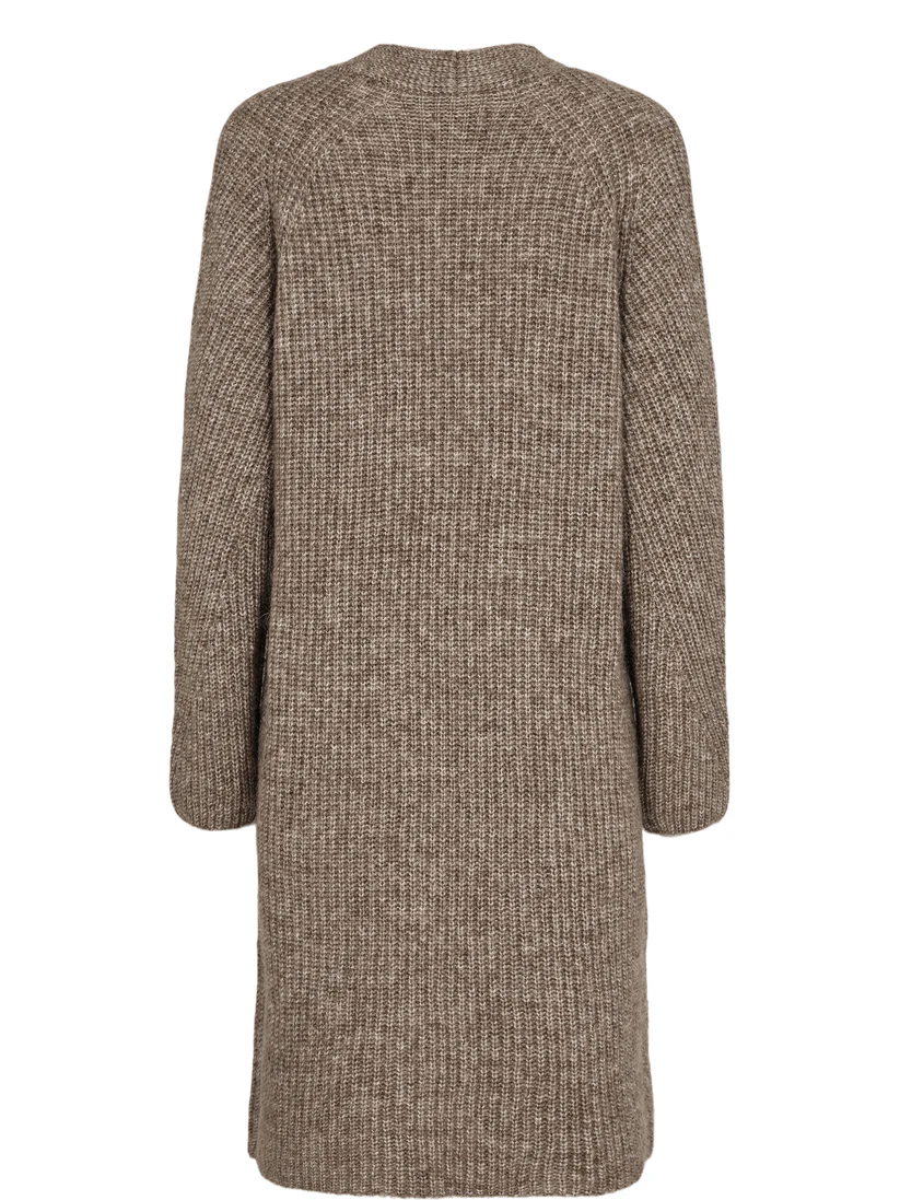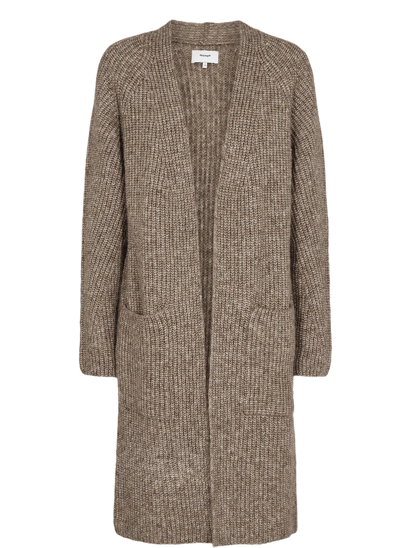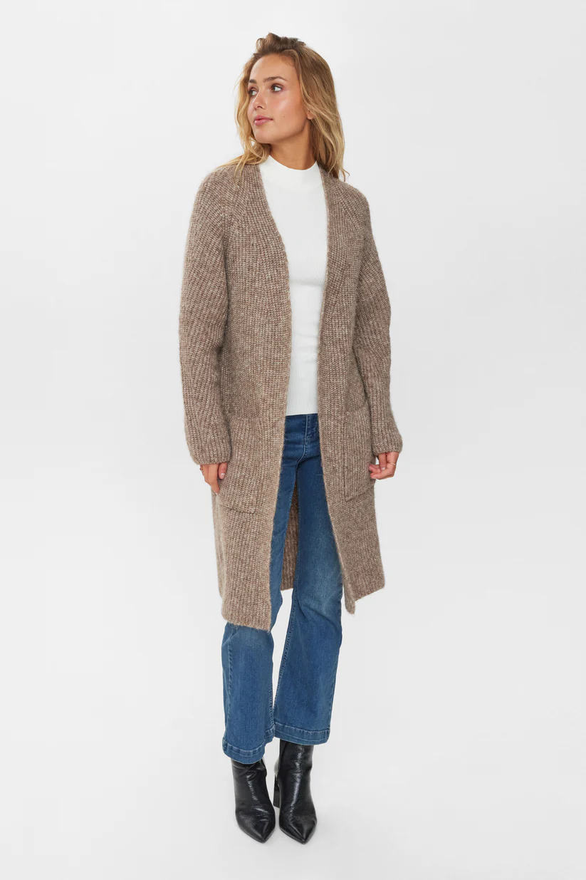 NUZINDI Long cardigan i farven Fossil Melange fra Nümph. Cardiganen er med påsyet lommer foran og er i skøn blød kvalitetet. Passer godt til både kjoler, bukser og nederdele.