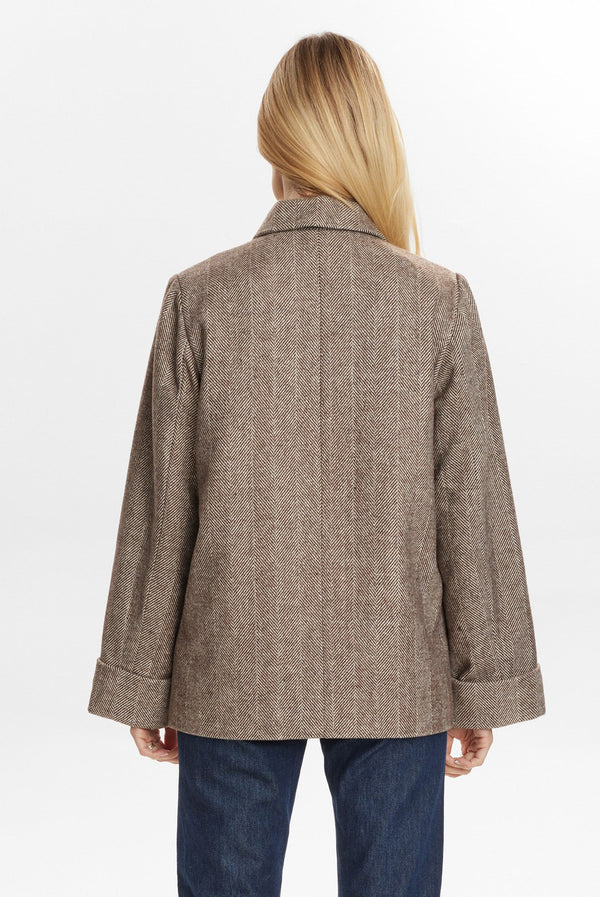 Kort frakke med sildebensmønster i et elegant A-formet snit. Designet har høj krave, dekorative knapper øverst og brede ærmer med opsmøg. Frakken har indvendig knaplukning samt usynlige lommer. En frakke med både fór og fyld, som holder dig varm i vintermånederne.