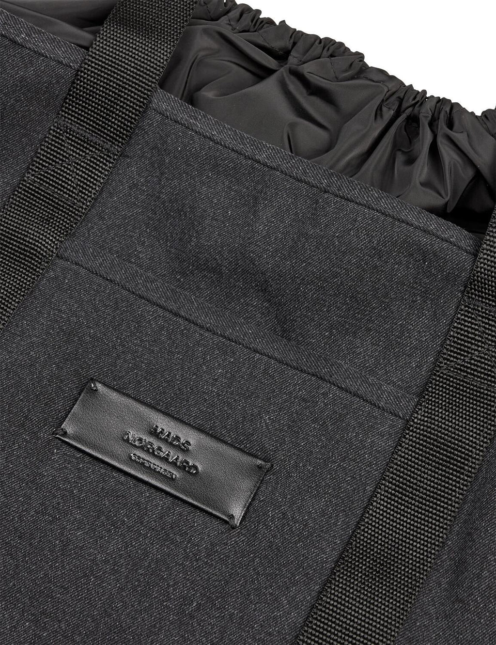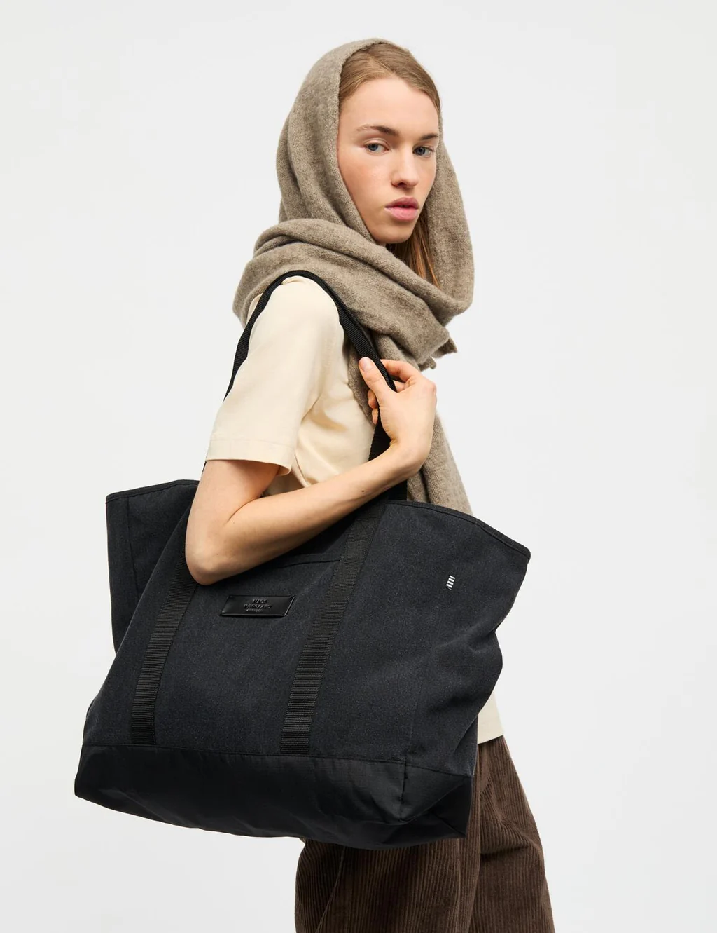 Denne store shopper fra Mads Nørgaard er fremstillet i en mørk denimlignende bomuldskvalitet med slidstærke detaljer. Tasken har to kraftige bærestropper i sort nylon, der kan bæres både over skulderen og i hånden