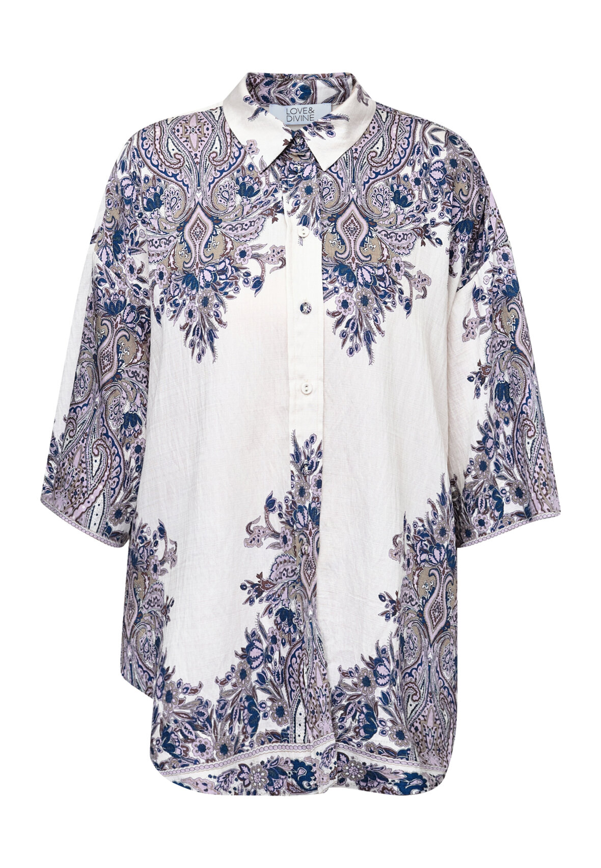Skjorten har lave skuldersømme, brede albuelange ærmer og klassisk knaplukning, der giver et afslappet og boheme-inspireret udtryk.