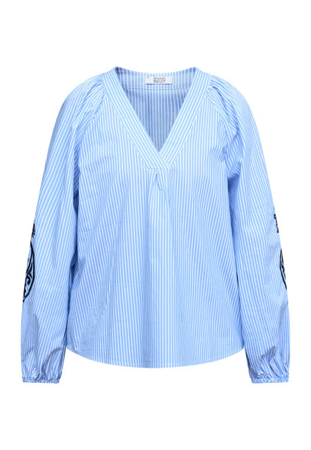 love1529 er en stribet poplin-bluse med feminine detaljer. Designet har en V-udskæring, ballonærmer og unikke, florale broderier, der skaber et luksuriøst bohemian-chic udtryk i en let kvalitet.