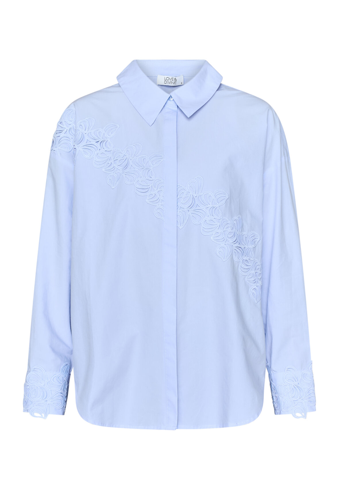 love1509 er en eksklusiv poplin-skjorte med et klassisk oversized snit med unikke, teksturerede ton-i-ton broderier. Skjorten er gennemknappet i fronten og har detaljerede cuffs.