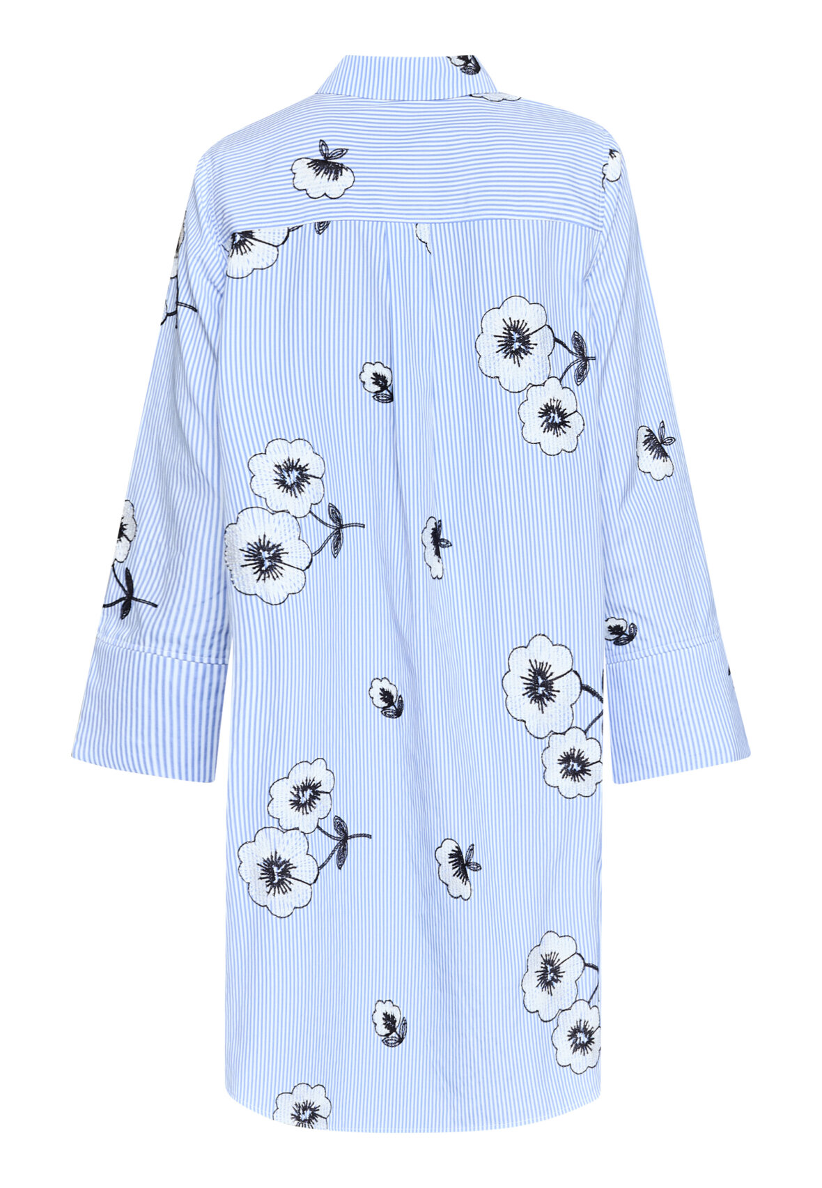 love1476 er en stribet skjortekjole med et unikt blomster broderi. Kjolen har lange voluminøse ærmer, klassisk krave og knaplukning.