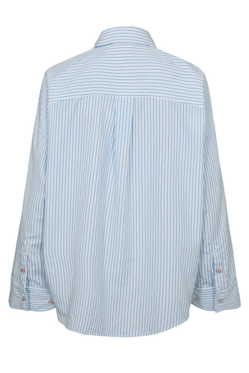 Mega fin skjorte fra Nümph. Skjorten er blå og hvid stribet med små søde broderet figurer. Den har brede ærmer og en flot pasform.