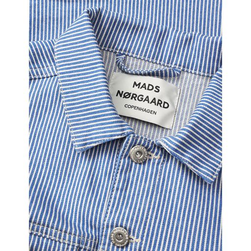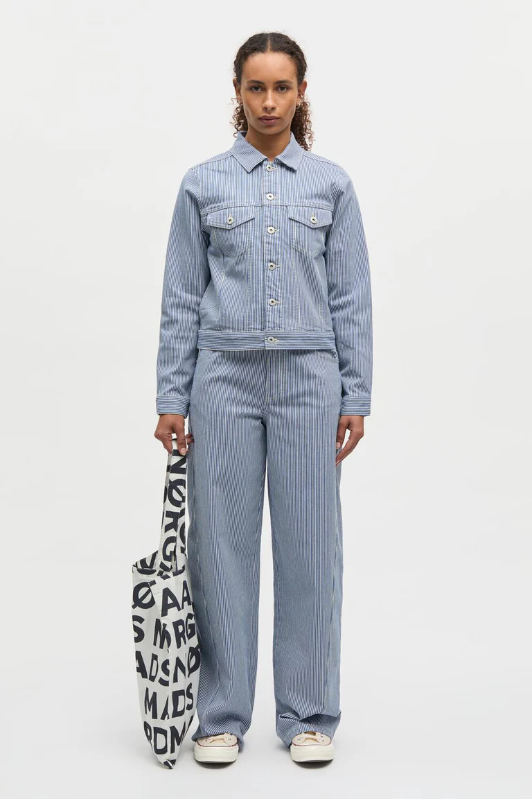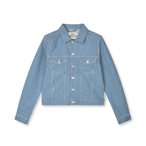 Kort og struktureret jakke i stribet denim med krave, tydelig knaplukning, formsyede brystlommer og stribede detaljer.