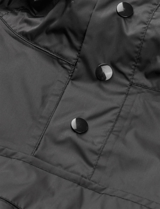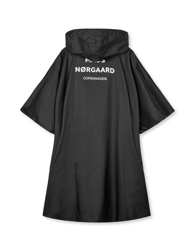 Regnpponcho med rummelig pasform, hætte med snøre, halv knaplukning og stor funktionel frontlomme. 5.000-10.000 waterproof rating / vandsøjletryk.