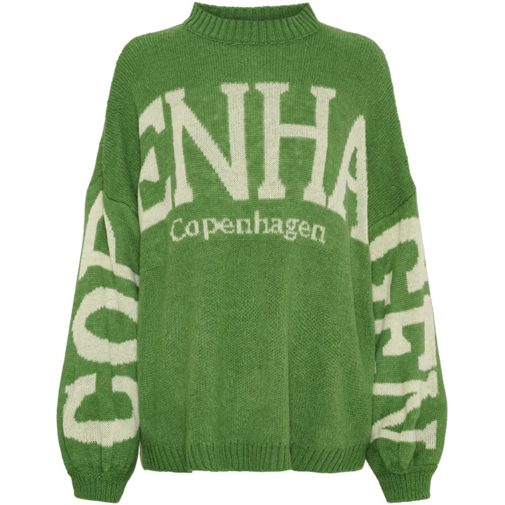På forsiden står teksten Copenhagen, og ærmerne har store bogstaver, der giver et trendy look.