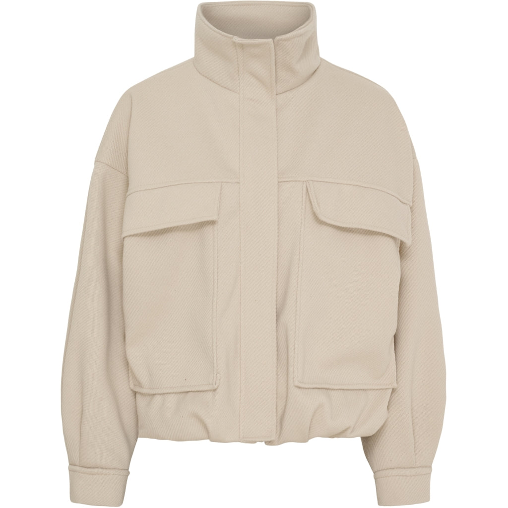 Jakken har høj krave, kort længde, lynlåslukning foran og store brystlommer samt elastik forneden, som giver et afslappet og stilrent udtryk – perfekt som overgangsjakke.