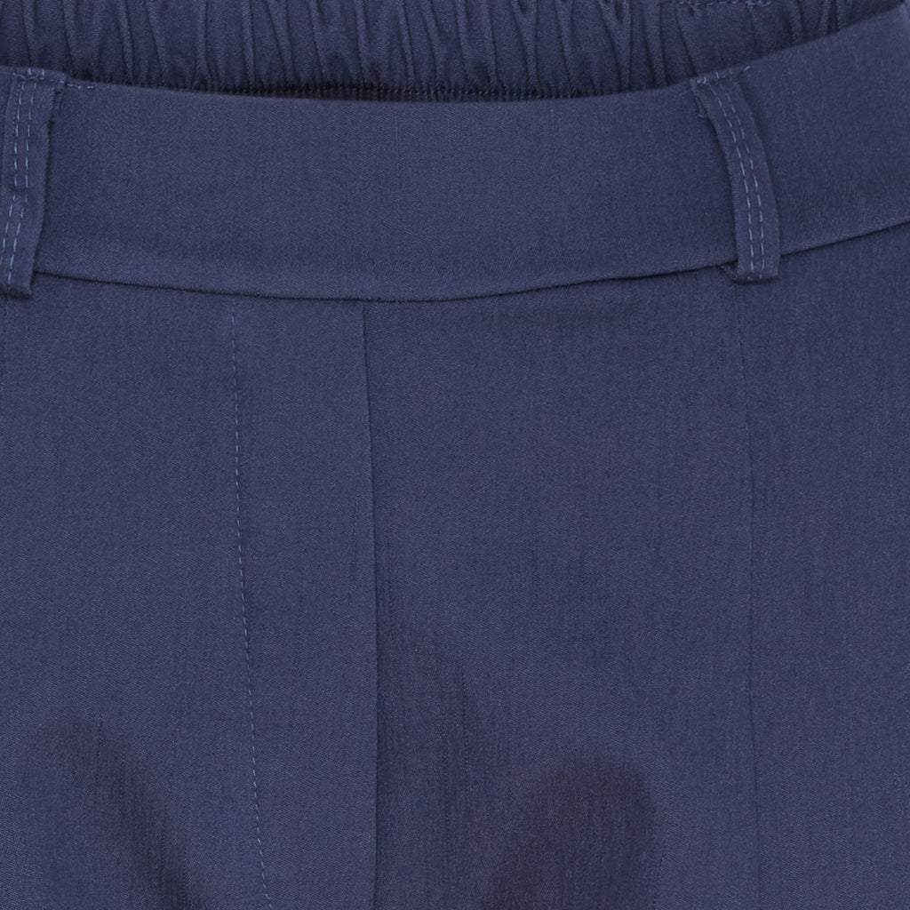 Bukserne har høj talje, klassisk lukning foran og lige ben samt elastik bagtil i linningen.
