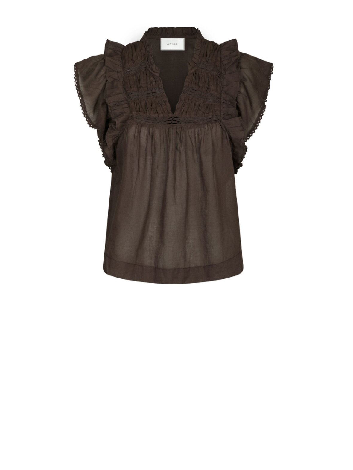 Ærmeløs top med blondebånd og flæsedetaljer. Toppen har en v-halsudskæring med en lille flæsekrave, læg på brystet og en løs pasform. Den er lavet i en let bomuldskvalitet.