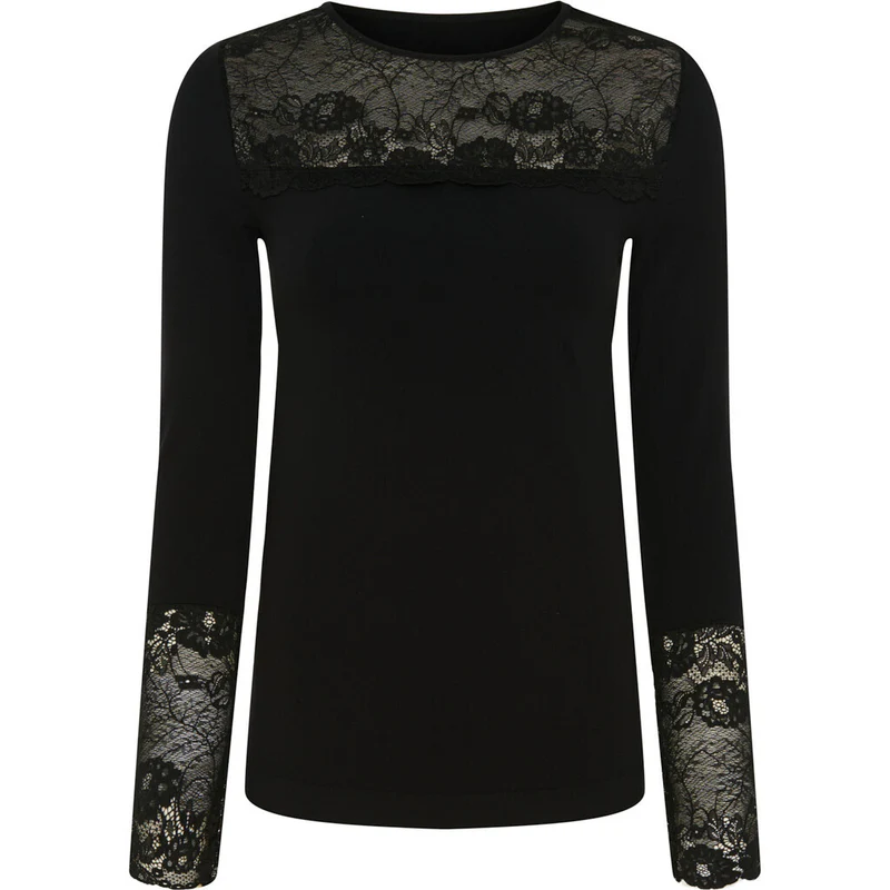 Langærmet bluse med blonde over bryst og blondeærmer.