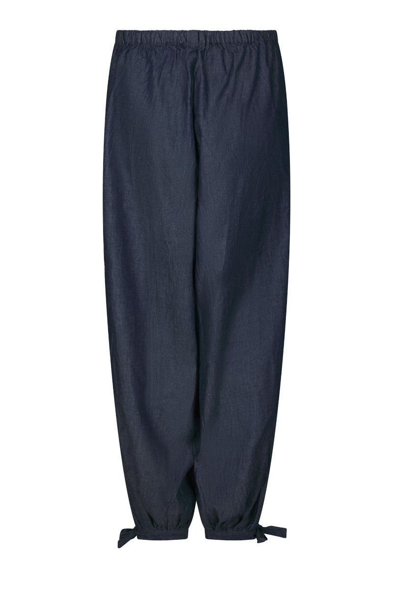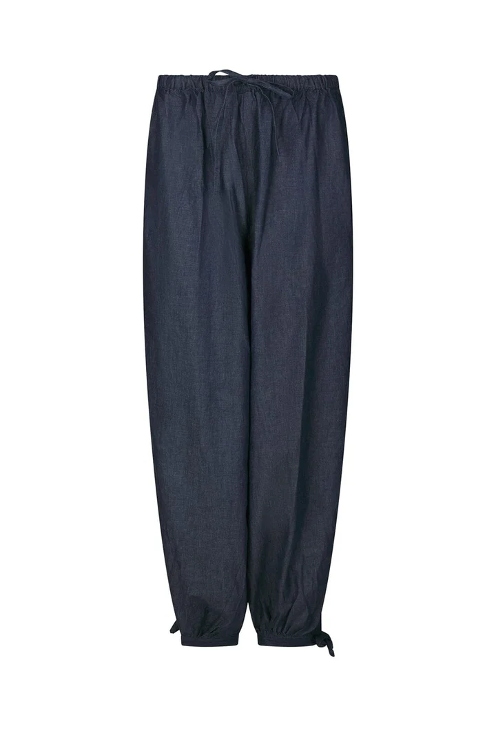 Blå denimbukser fra Neo Noir i 100 % bomuld. Bukserne har en ballon-silhuet med bredere ben, der tilspidses ved anklerne, og en høj talje med elastik og snøre.