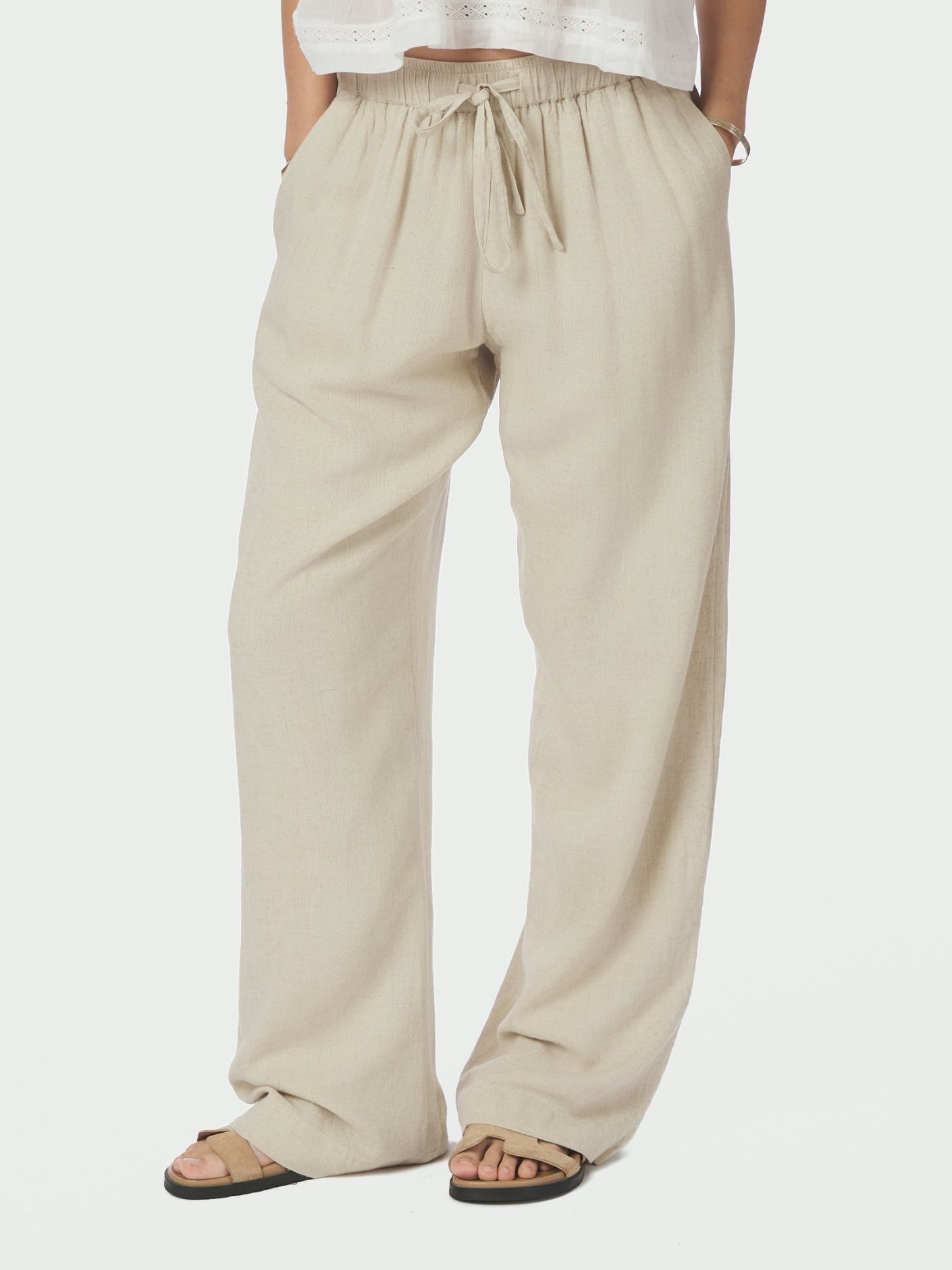 Lette og seje bukser i en blød blanding af hør. Bukserne har brede ben og elastik samt snor i taljen.