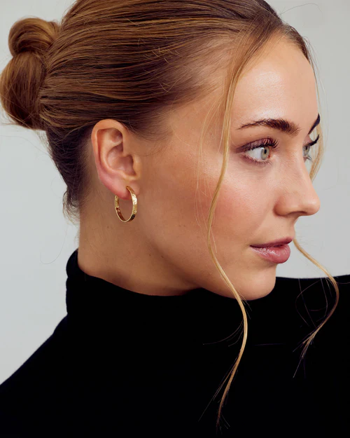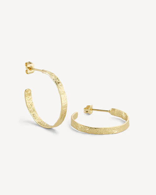 Dina Øreringe – Enkle og elegante hoops. Elegante hoop øreringe i 18 karat forgyldt med en smuk, banket tekstur, der fanger lyset og giver et unikt, håndlavet udtryk. Et tidløst valg til både hverdag og fest.