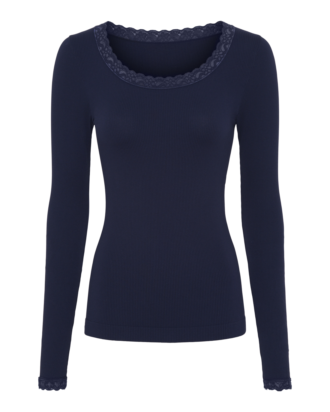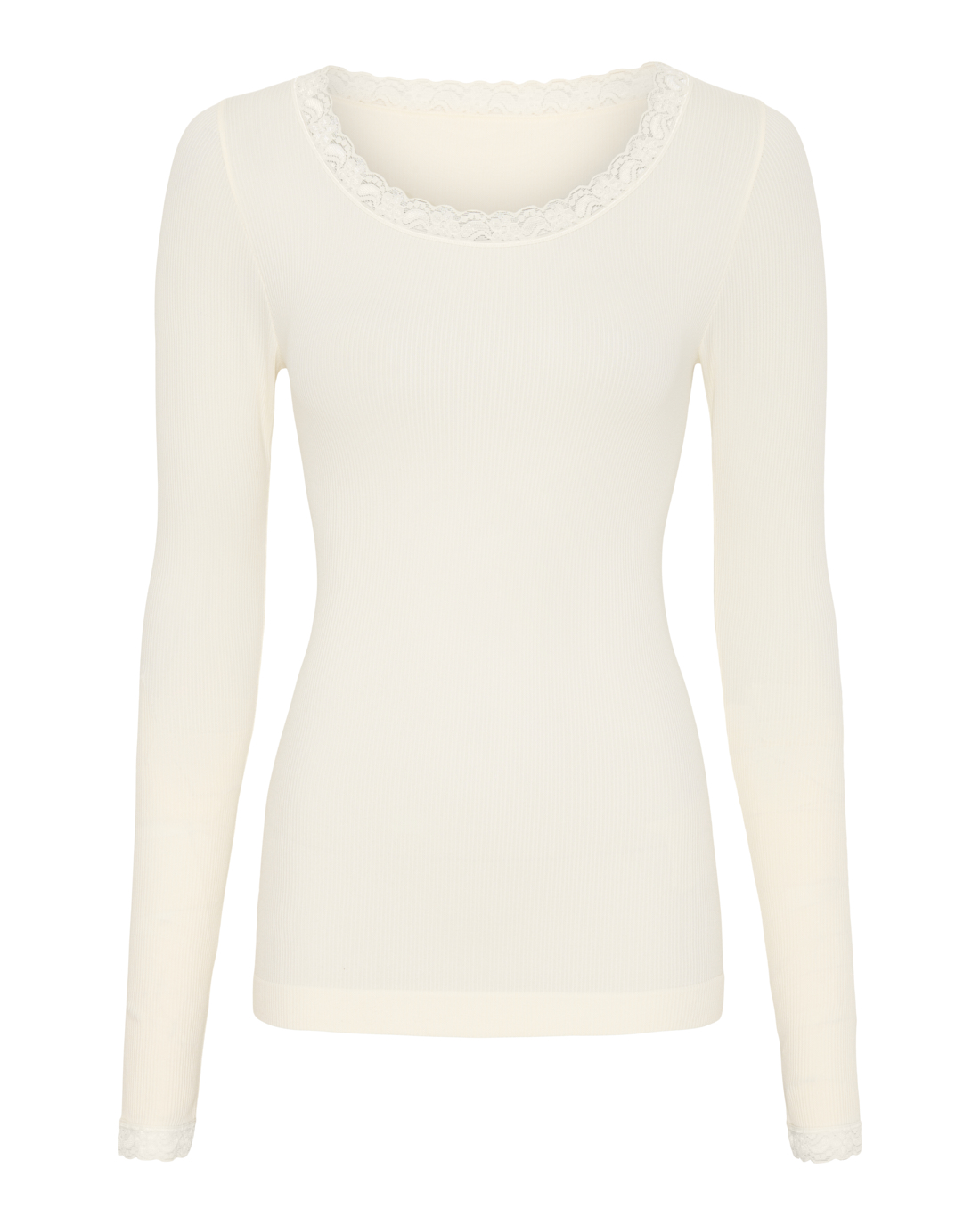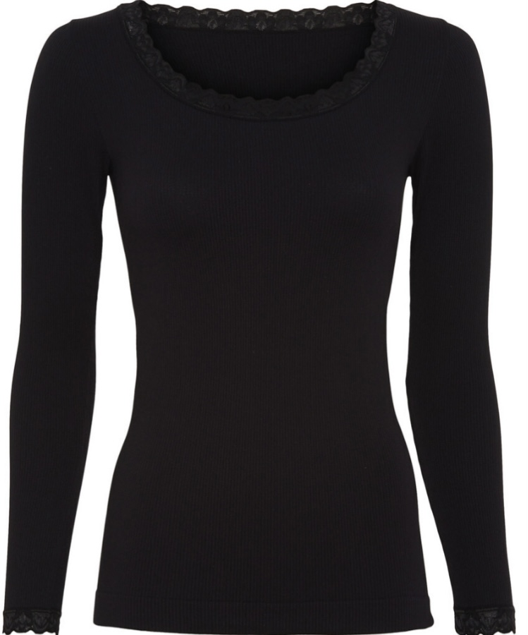 Blusen fra Tim og Simonsen er i 100% ribstrikket microfiber, plus size med rund halsudskæring og er med en fin smal blondekant i halsen og ved ærmerne.