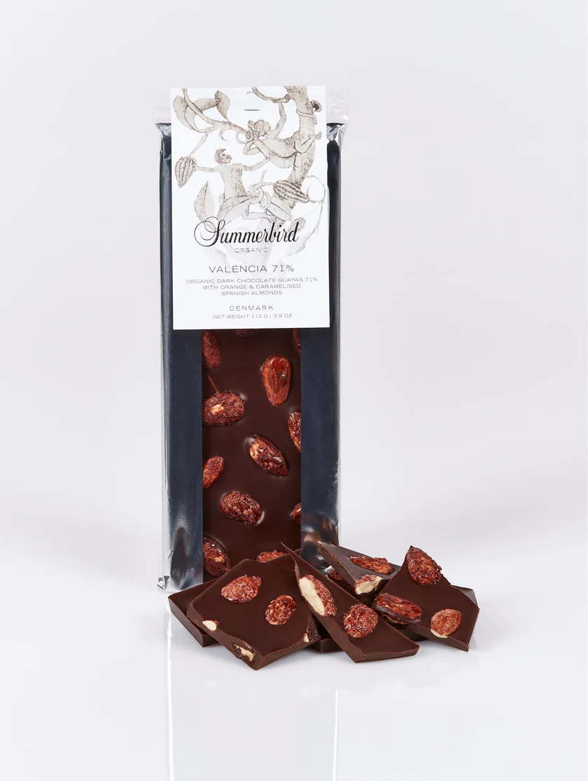 En mørk chokoladebar, let parfumeret med orange, drysset med karamelliserede økologiske spanske mandler og baseret på vores mørke chokolade Guayas 71 % af kakaobønnen Arriba Nacional, der vokser langs Guayas-floden i Ecuador og anses for at være blandt de fineste i verden. En dyb og kraftfuld chokoladebar med en sprød tekstur.