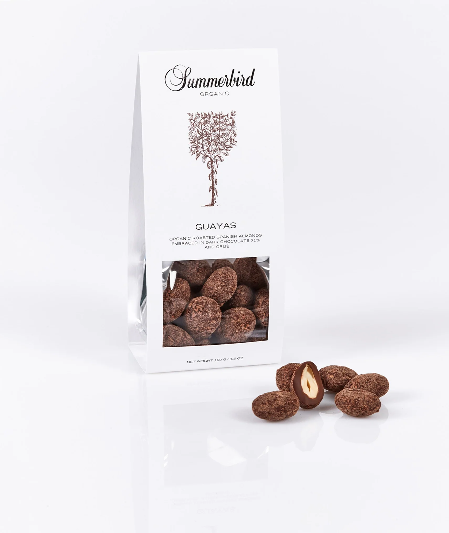 Let ristede økologiske spanske mandler, drageret i et tyndt lag nougat, mørk chokolade Guayas 71 % og vendt i let ristede knuste kakaobønner af sorten Arriba Nacional, der anses for at være en af verdens ædleste kakaobønner – kendt for sin florale aroma og komplekse smagsprofil.