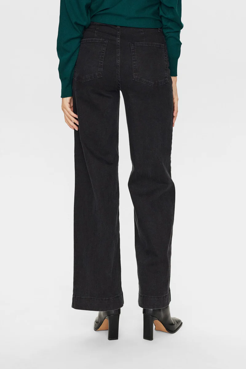 Skøn denim buks med lange, brede ben. Lukkes med lynlås og knap og er medium høj i taljen. Har skrålommer foran og almindelige bagpå.