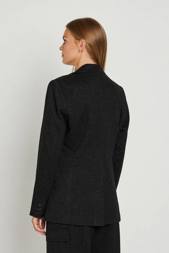 Elly Blazer er en stilfuld og alsidig blazer, der tilføjer et professionelt touch til enhver garderobe. Med små dropped shoulders, en klassisk krave og lapel, samt en enkel front, er Elly Blazer perfekt til både arbejde og formelle begivenheder. Denne blazer er en del af en matchende serie, der inkluderer Melissa Pants, Olana Pants og Carla Skirt.
